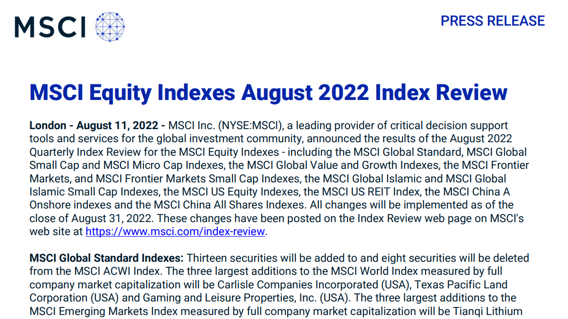 北京时间8月12日早间,,,,,,,,全球着名指数公司MSCI宣布了季度审核变换效果,,,,,,,,将非凡国际锂业等7只A股股票新纳入MSCI中国指数。。。。。